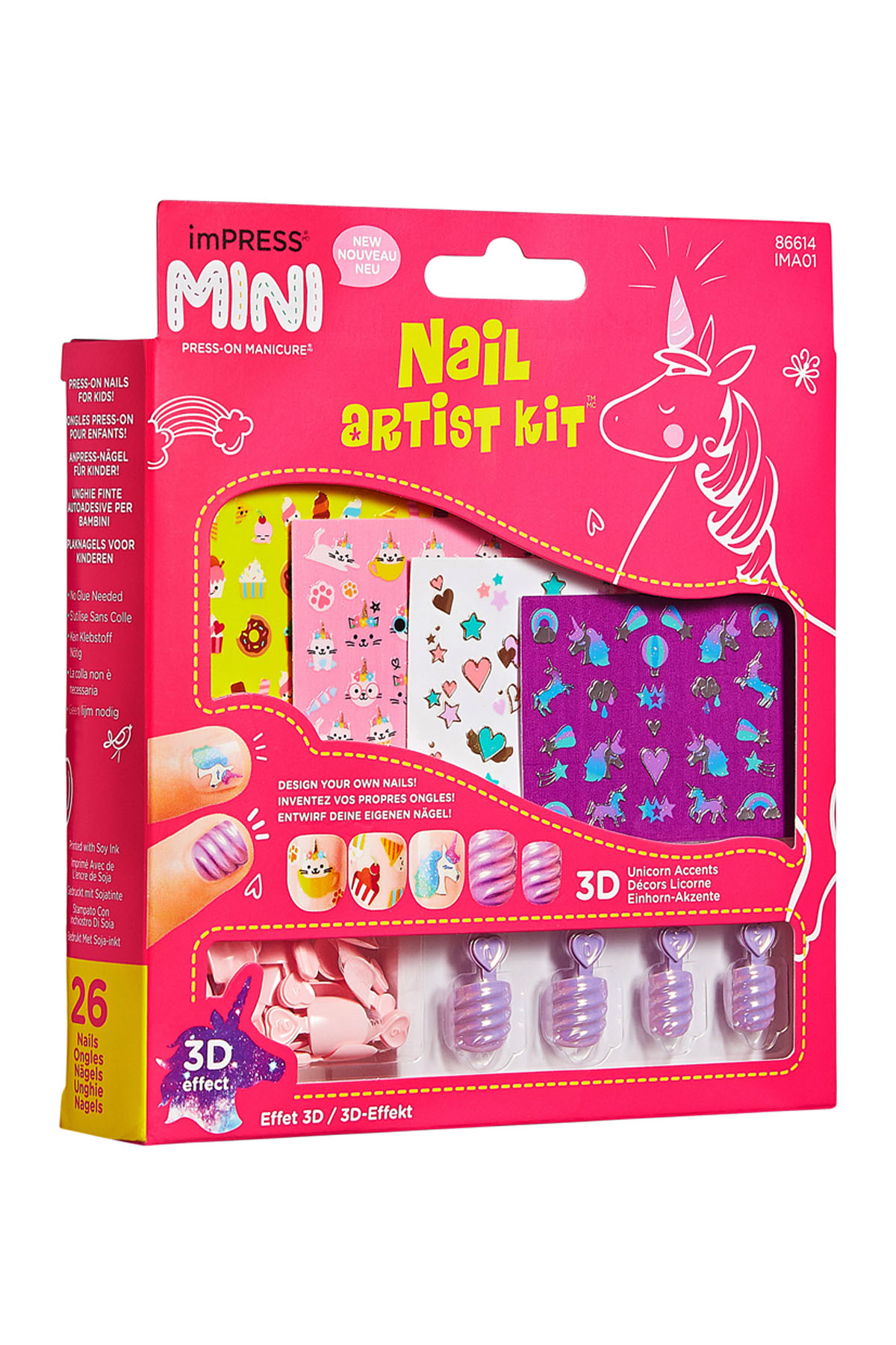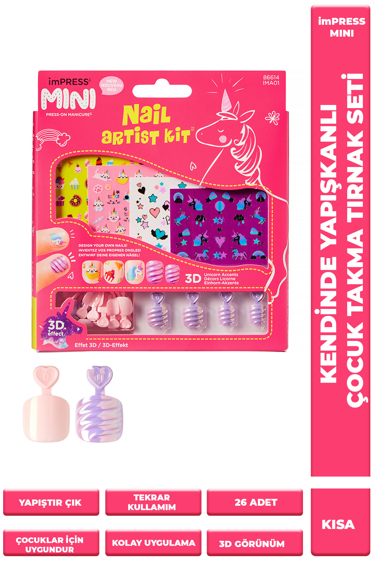imPress Mini 3D takma tırnak seti ile trend renkleri bul tak yapıştır çık tırnaklar oldukça pratik. Kullanım şekli: • Her bir tırnağınıza uyum sağlayan imPress tırnağı bulun ve 10 parmağı tamamlayınca yan yana sırasıyla dizin. Tırnağın altındaki koruyucu tabakanın görünen kısmı tırnak dibine gelecek şekilde hizalayın. • Koruyucu tabakayı çekerek çıkartın. İyice bastırarak yapıştırın. Sticker uygulama: Yapışkanları kağıttan dikattlice çıkartın.Ürünün Özellikleri:7 ile 13 Yaş Çocuklar İçin Yepyeni Bir Eğlence Kendinden Yapışkanlı Tırnaklar.Ürün İçeriği:.26 adet küçük Renkli takma tırnak. 4 adet tasarım kağıdı Sticker Uygulama :Yapışkan kağıttan dikkatlice çıkartılır. Tırnaklarda oje varsa kuru olduğuna emin olunmalıdır. Yapışkanlar istenilen pozisyonda yapıştırılıp nazikçe bastırılır. İstenirse tüm tırnak üzerine parlatıcı oje uygulanabilir. Nasıl Çıkartılır: Tırnaklar ılık suda bekletilir. Yapıştırıcı yumuşadıktan sonra takma tırnak nazikçe çekilerek çıkartılır.