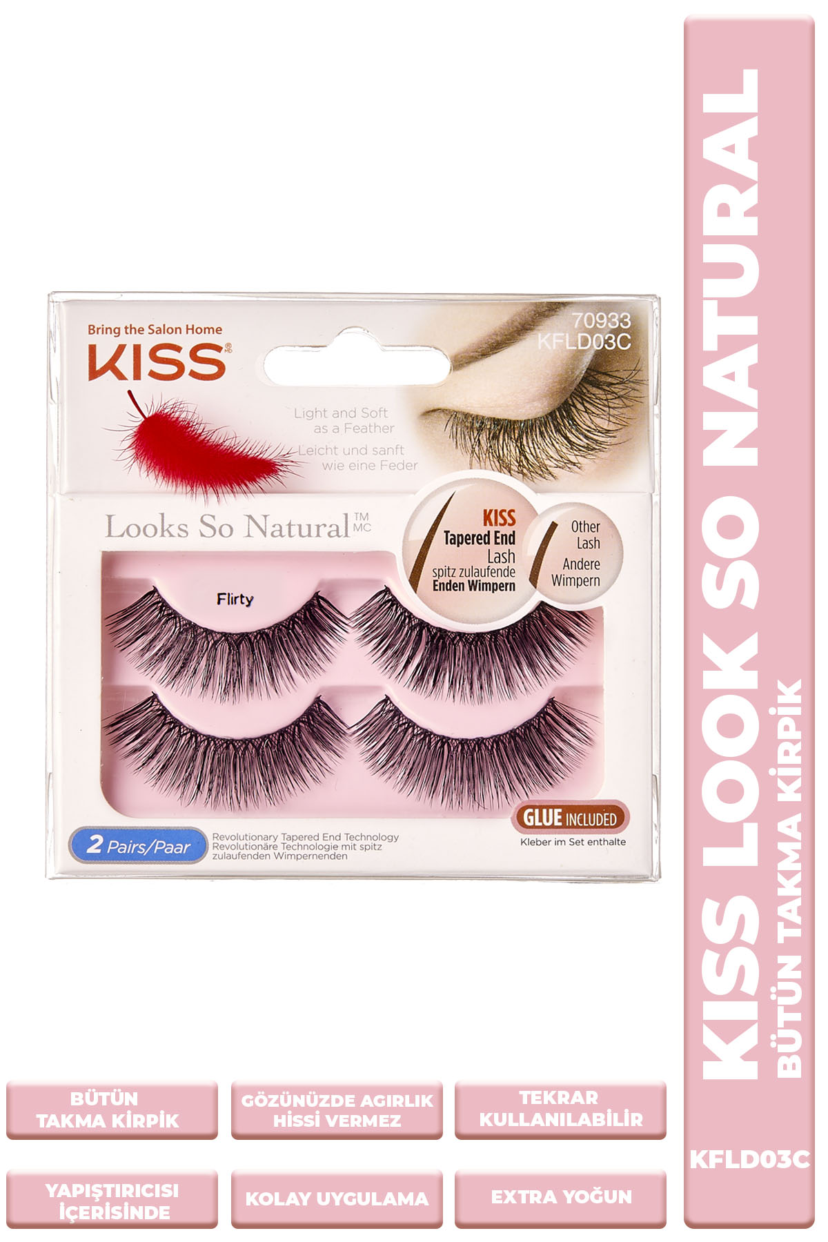 Kiss Look So Naturel gözlerinizin doğal güzelliğini arttırmanızı, bakışlarınıza anlam kazandırmanızı sağlar. Tüm göz şekilleri için uygundur. Her gün veya özel günler için kullanım idealdir. Kullanım şekli: Bir cımbız yardımıyla kirpiği kutudan çıkartın. Gerekli gördüğünüz takdirde kirpikleri yanlarından keserek göz şekline göre kısaltabilirsiniz. Kirpiğin dip kısmını hizalayarak yapıştırıcıyı sürün, 20-30 saniye kadar bekleyin ve doğal kirpiklerinizin diplerini hizalayarak yapıştırın. Maskara sürmeden önce 5 dakika bekleyin. Kirpikleri çıkartma: Gözünüzün dış kısmından başlayarak kirpikleri yavaşça çekerek çıkartın. Kirpik üzerinde kalan yapıştırıcıyı temizleyerek sonraki kullanımlar için kirpiği tekrar kutusuna yerleştirin. Yapıştırıcısı içindedir.