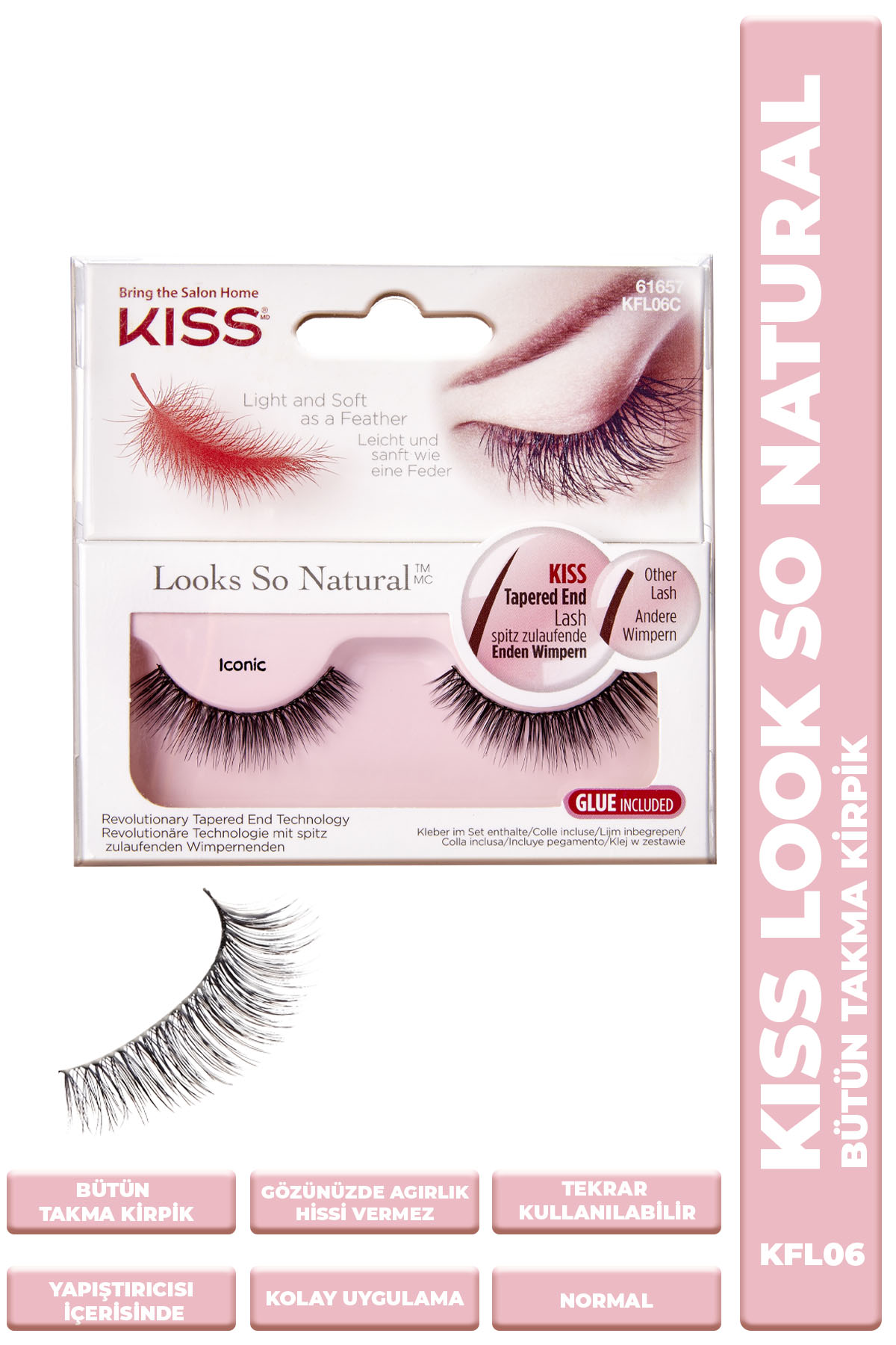 En doğal görünümlü takma kirpik. El yapımı, taş ile öğütülerek üretilmiştir. Uçları inceltilmiştir. Hafifleştirilmiş yapısıyla tüy kadar hafiftir. Kullanım şekli: Bir cımbız yardımıyla kirpiği kutudan çıkartın. Gerekli gördüğünüz takdirde kirpikleri yanlarından keserek göz şekline göre kısaltabilirsiniz. Kirpiğin dip kısmını hizalayarak yapıştırıcıyı sürün ve 20-30 saniye bekleyin. Daha sonra doğal kirpiklerinizin diplerini hizalayarak yapıştırın. Maskara sürmeden önce 5 dakika bekleyin. Kirpikleri çıkartma: Gözünüzün dış kısmından başlayarak kirpikleri yavaşça çekerek çıkartın. Kirpik üzerinde kalan yapıştırıcıyı temizleyerek sonraki kullanımlar için kirpiği tekrar kutusunu yerleştirin. Takma kirpik yapıştırıcısı içindedir.