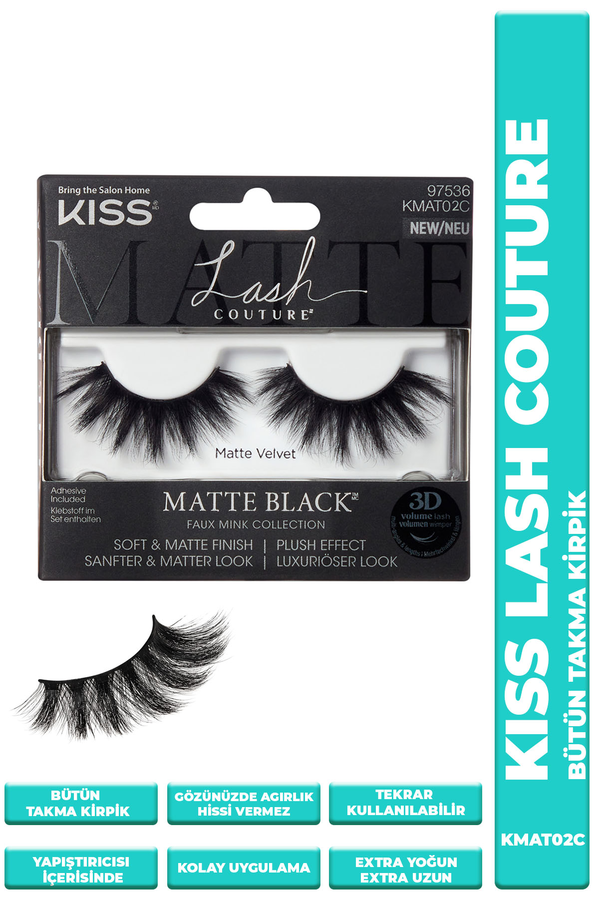 Kiss lash couture matte black komple takma kirpikler ile dolgun ve uzun kirpiklere kavuşun. Siyah esnek kirpik bandı sayesinde gözlerinizde eyeliner efekti yaratan kiss lash couture takma kirpikleri, knot- Free teknolojisi ile üretilmiştir. Çoklu katmanlı kirpik dizaynı ve ağırlık yapmayan kıvrık yapısı sayesinde gözlerinizde hafif ve rahat bir his bırakır. Kutu içerisinde yapıştırıcısı mevcuttur. Özel proteinli yapıştırıcısı ile kirpik diplerinize bakım yapar. Kolaylıkla takılıp, çıkartılır ve mevcut kirpiklere zarar vermez. Tüm göz şekilleri için uygundur. Her gün veya özel günler için kullanım idealdir. Tekrar kullanılabilir. Kullanım şekli: Bir cımbız yardımıyla kirpiği kutudan çıkartın. Gerekli gördüğünüz takdirde kirpikleri yanlarından keserek göz şekline göre kısaltabilirsiniz. Kirpiğin dip kısmını hizalayarak yapıştırıcıyı sürün, 20-30 saniye kadar bekleyin ve doğal kirpiklerinizin diplerini hizalayarak yapıştırın. Tercihe göre maskara sürmeden önce 5 dakika bekleyin. Kirpikleri çıkartma: Gözünüzün dış kısmından başlayarak kirpikleri yavaşça çekerek çıkartın. Kirpik üzerinde kalan yapıştırıcıyı temizleyerek sonraki kullanımlar için kirpiği tekrar kutusunu yerleştirin.