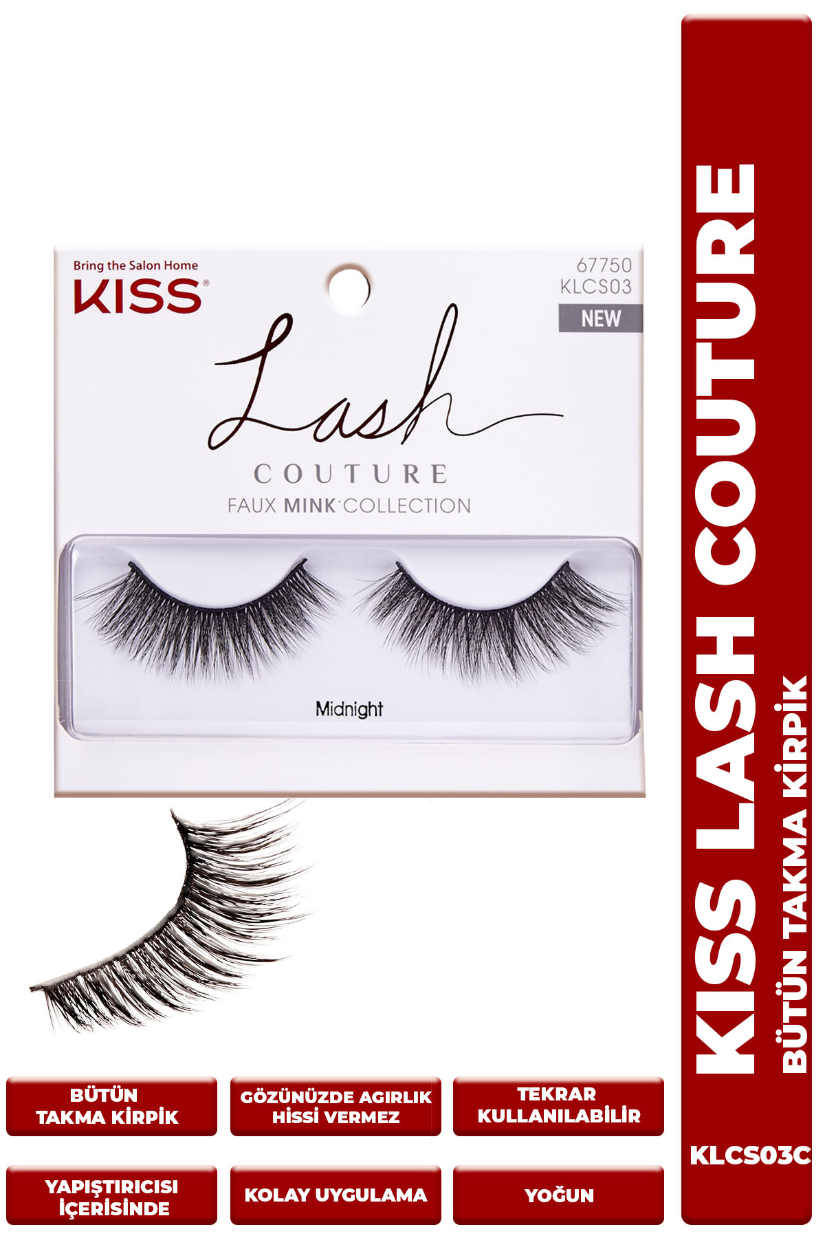 Kiss Lash Couture Komple Takma Kirpik Tekrar kullanılabilir Yapıştırıcı içindedir Kiss Lash Couture Faux Mink komple takma kirpikler ile dolgun ve uzun kirpiklere kavuşun Siyah esnek kirpik bandı sayesinde gözlerinizde eyeliner efekti yaratan Kiss Lash Couture takma kirpikleri, Knot Free teknolojisi ile üretilmiştir Çoklu katmanlı kirpik dizaynı ve ağırlık yapmayan kıvrık yapısı sayesinde gözlerinizde hafif ve rahat bir his bırakır Kutu içerisinde yapıştırıcısı mevcuttur Özel proteinli yapıştırıcısı ile kirpik diplerinize bakim yapar Kolaylıkla takılıp, çıkartılır ve mevcut kirpiklere zarar vermez Tüm göz şekilleri için uygundur Her gün veya özel günler için kullanım idealdir Tekrar kullanılabilir kullanım şekli: Bir cımbız yardımıyla kirpiği kutudan çıkartın Gerekli gördüğünüz takdirde kirpikleri yanlarından keserek göz şekline göre kısaltabilirsiniz Kirpiğin dip kısmını hizalayarak yapıştırıcıyı sürün, 20 30 saniye kadar bekleyin ve doğal kirpiklerinizin diplerini hizalayarak yapıştırın Tercihe göre maskara sürmeden önce 5 dakika bekleyin Kirpikleri çıkartma: Gözünüzün diş kısmından başlayarak kirpikleri yavaşça çekerek çıkartın Kirpik üzerinde kalan yapıştırıcıyı temizleyerek sonraki kullanımlar için kirpiği tekrar kutusunu yerleştirin