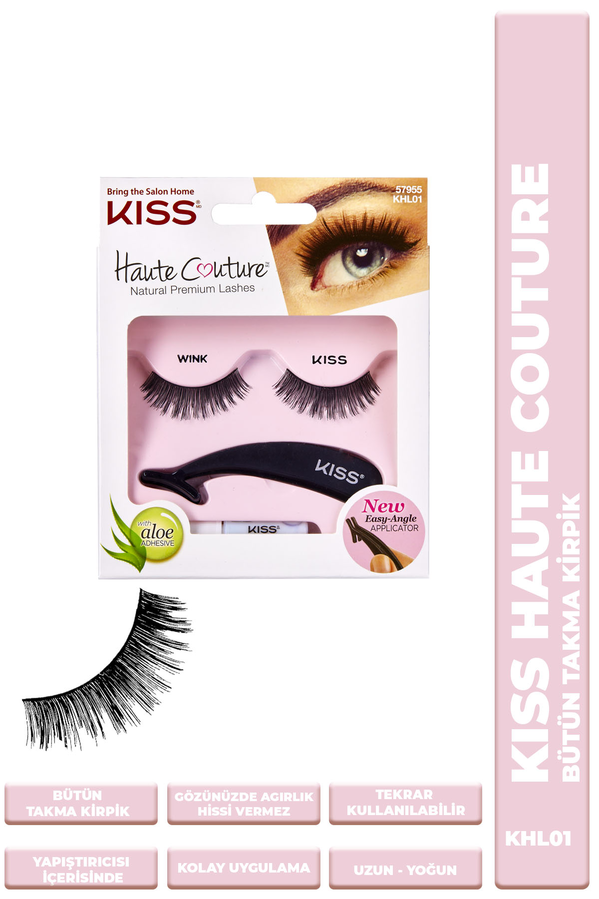 Kiss Haute Couture gözlerinizin doğal güzelliğini arttırmanızı, bakışlarınıza anlam kazandırmanızı sağlar. Tüm göz şekilleri için uygundur. Her gün veya özel günler için kullanım idealdir. Kullanım şekli: Bir cımbız yardımıyla kirpiği kutudan çıkartın. Gerekli gördüğünüz takdirde kirpikleri yanlarından keserek göz şekline göre kısaltabilirsiniz. Kirpiğin dip kısmını hizalayarak yapıştırıcıyı sürün, 20-30 saniye kadar bekleyin ve doğal kirpiklerinizin diplerini hizalayarak yapıştırın. Maskara sürmeden önce 5 dakika bekleyin. Kirpikleri çıkartma: Gözünüzün dış kısmından başlayarak kirpikleri yavaşça çekerek çıkartın. Kirpik üzerinde kalan yapıştırıcıyı temizleyerek sonraki kullanımlar için kirpiği tekrar kutusunu yerleştirin.