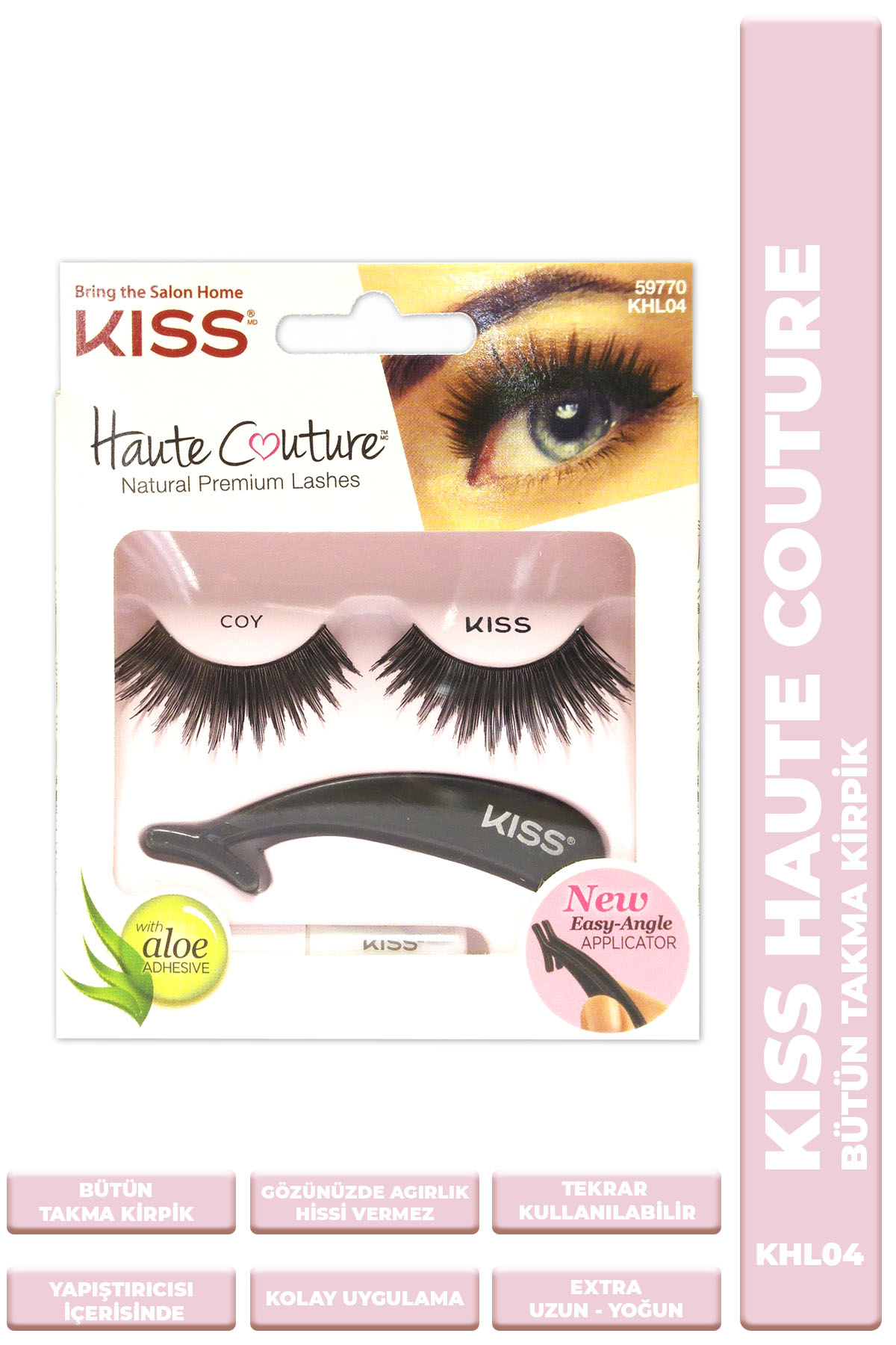 Kiss Haute Couture gözlerinizin doğal güzelliğini arttırmanızı, bakışlarınıza anlam kazandırmanızı sağlar. Tüm göz şekilleri için uygundur. Her gün veya özel günler için kullanım idealdir. Kullanım şekli: Bir cımbız yardımıyla kirpiği kutudan çıkartın. Gerekli gördüğünüz takdirde kirpikleri yanlarından keserek göz şekline göre kısaltabilirsiniz. Kirpiğin dip kısmını hizalayarak yapıştırıcıyı sürün, 20-30 saniye kadar bekleyin ve doğal kirpiklerinizin diplerini hizalayarak yapıştırın. Maskara sürmeden önce 5 dakika bekleyin. Kirpikleri çıkartma: Gözünüzün dış kısmından başlayarak kirpikleri yavaşça çekerek çıkartın. Kirpik üzerinde kalan yapıştırıcıyı temizleyerek sonraki kullanımlar için kirpiği tekrar kutusunu yerleştirin.