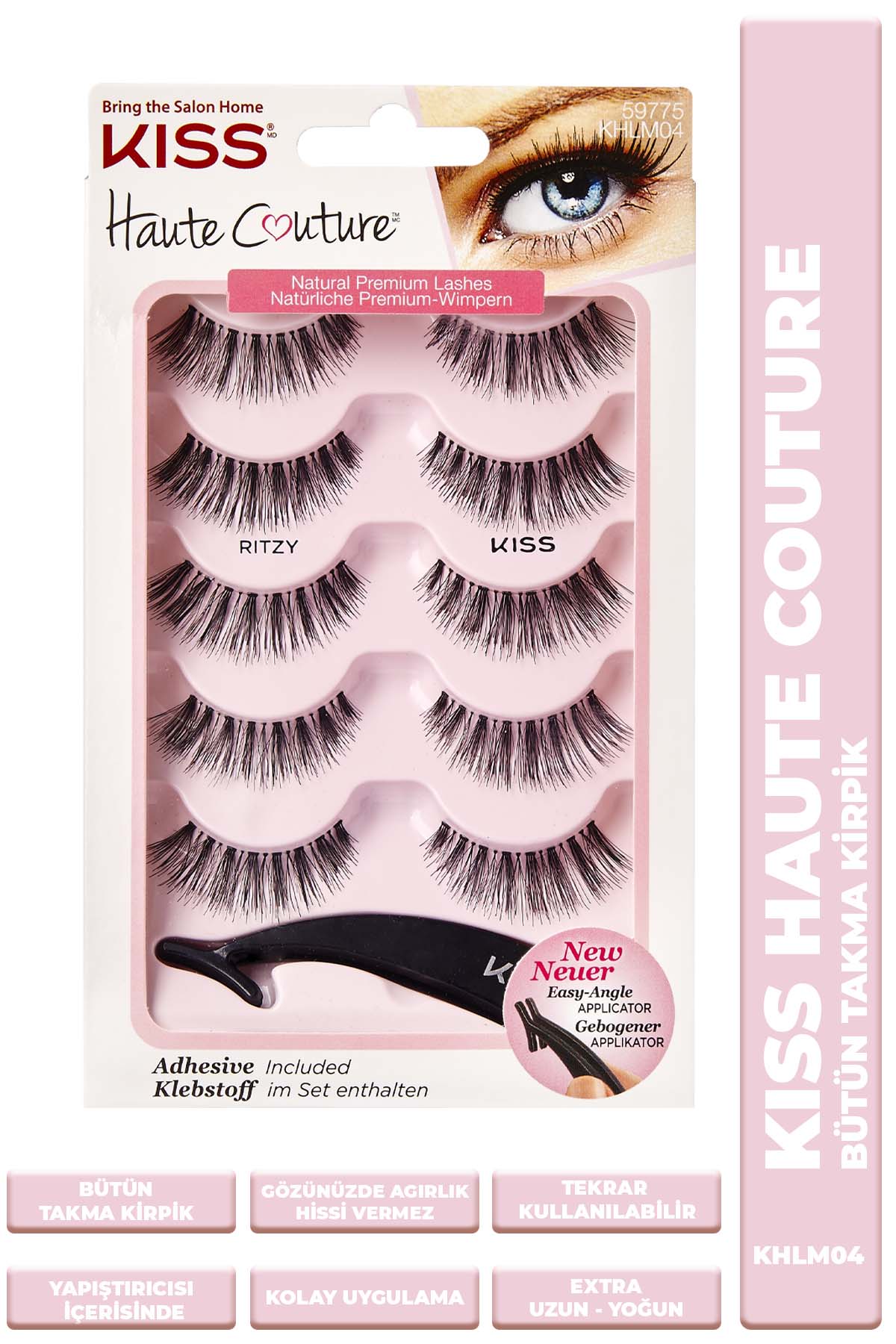 Kiss Haute Couture gözlerinizin doğal güzelliğini arttırmanızı, bakışlarınıza anlam kazandırmanızı sağlar. Tüm göz şekilleri için uygundur. Her gün veya özel günler için kullanım idealdir. Kullanım şekli: Bir cımbız yardımıyla kirpiği kutudan çıkartın. Gerekli gördüğünüz takdirde kirpikleri yanlarından keserek göz şekline göre kısaltabilirsiniz. Kirpiğin dip kısmını hizalayarak yapıştırıcıyı sürün, 20-30 saniye kadar bekleyin ve doğal kirpiklerinizin diplerini hizalayarak yapıştırın. Maskara sürmeden önce 5 dakika bekleyin. Kirpikleri çıkartma: Gözünüzün dış kısmından başlayarak kirpikleri yavaşça çekerek çıkartın. Kirpik üzerinde kalan yapıştırıcıyı temizleyerek sonraki kullanımlar için kirpiği tekrar kutusunu yerleştirin.