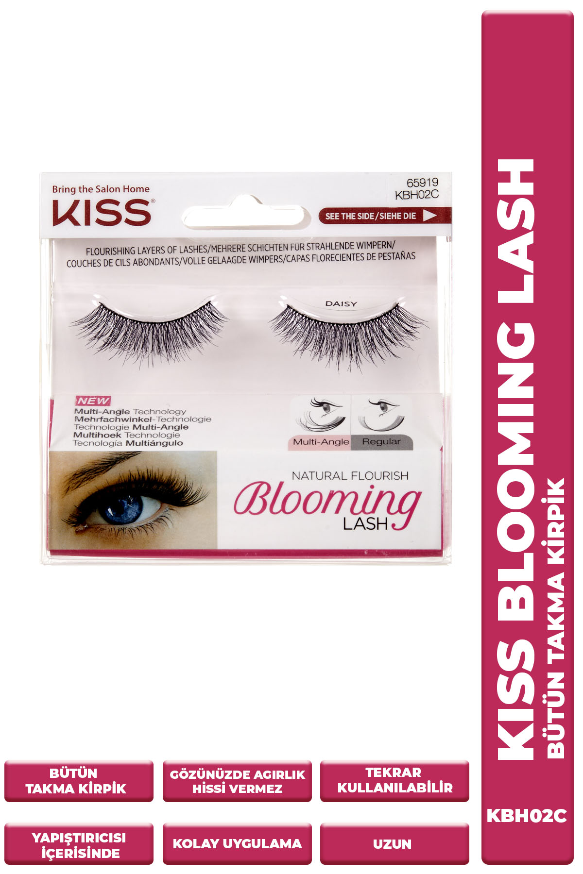 Blooming Lash ile göz alıcı ve çarpıcı bakışlara sahip olun. Multi-Angle teknolojisi, tek kirpik hizasında 3 katmanlı kirpik dizaynı ile takma kirpik tasarımında şuana kadarki en yenilikçi ürün. • Çok Açılı Teknolojiyle oluşturulmuştur. • Yapıştırıcısı içindedir. • Kirpiklere uzunluk, derinlik ve hacim verir. • Amerika'nın takma kirpik uzmanları tarafından tasarlanmıştır. Nasıl Kullanılır? • Bir cımbız yardımıyla kirpiği kutudan çıkartın. Gerekli gördüğünüz takdirde kirpikleri yanlarından keserek göz şekline göre kısaltabilirsiniz. Kirpiğin dip kısmını hizalayarak yapıştırıcıyı sürün, 20-30 saniye kadar bekleyin ve doğal kirpiklerinizin diplerini hizalayarak yapıştırın. Maskara sürmeden önce 5 dakika bekleyin. Nasıl Çıkartılır? • Gözünüzün dış kısmından başlayarak kirpikleri yavaşça çekerek çıkartın. Kirpik üzerinde kalan yapıştırıcıyı temizleyerek sonraki kullanımlar için kirpiği tekrar kutusunu yerleştirin.