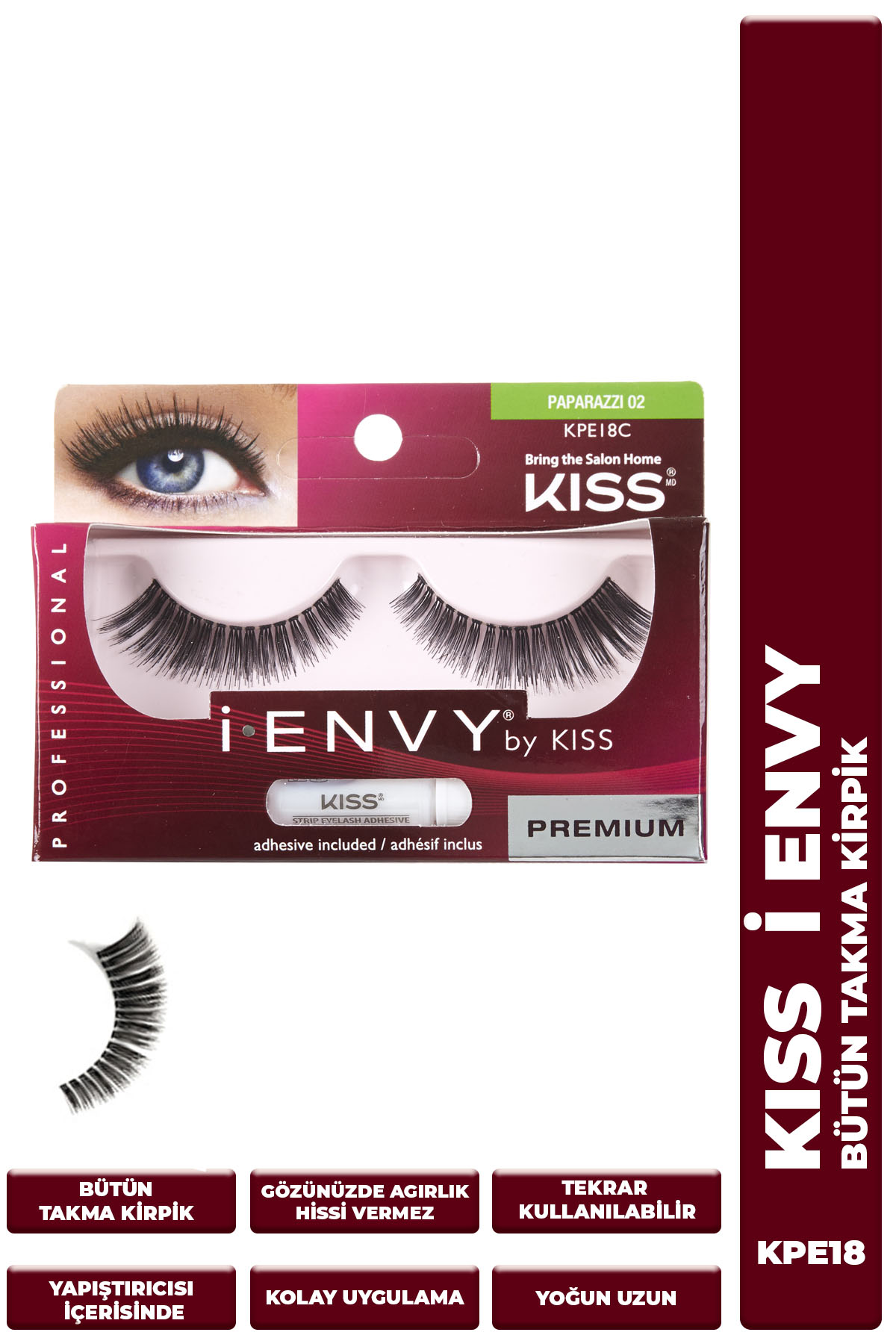 Yüzde yüz kaliteli insan saçından yapılmış olan Kiss i-Envy takma kirpik ince ve uyumlu dokusu ile her gün veya özel günlerde kullanım için idealdir. Son derece hafif dokusundan dolayı göz kapağında ağırlık hissi yaratmaz. Kullanım şekli: Bir cımbız yardımıyla kirpiği kutudan çıkartın. Gerekli gördüğünüz takdirde kirpikleri yanlarından keserek göz şekline göre kısaltabilirsiniz. Kirpiğin dip kısmını hizalayarak yapıştırıcıyı sürün, 20-30 saniye kadar bekleyin ve doğal kirpiklerinizin diplerini hizalayarak yapıştırın. Maskara sürmeden önce 5 dakika bekleyin. Kirpikleri çıkartma: Gözünüzün dış kısmından başlayarak kirpikleri yavaşça çekerek çıkartın. Kirpik üzerinde kalan yapıştırıcıyı temizleyerek sonraki kullanımlar için kirpiği tekrar kutusunu yerleştirin.