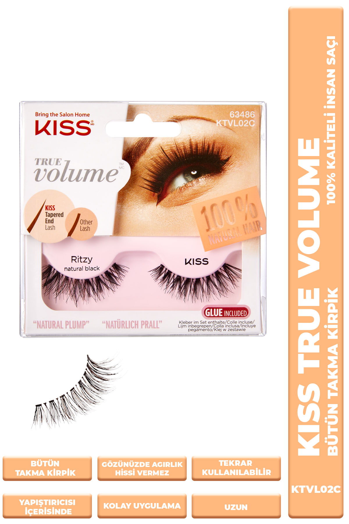 • True Volume komple takma kirpikler %100 insan saçından yapılmıştır. • Konik Uçlu Kirpik Teknolojisi ile piyasadaki en hafif ve en doğal kirpiklerin kendi kirpiklerinizle kusursuz bir şekilde karışmasını sağlar. • Aynı anda daha doğal ve daha dolgun bir görünüm sağlar. • Esnek Kirpik bandı sayesinde uygulama sonrasında gözlerinizde hafif ve rahat bir his bırakır. • Kutu içerisinde yapıştırıcısı mevcuttur. • Özel proteinli yapıştırıcısı ile kirpik diplerinize bakım yapar. • Kolaylıkla takılıp, çıkartılır ve mevcut kirpiklere zarar vermez. • Kutu ile birlikte kullanma kılavuzu içerisindedir. • Tüm göz şekilleri için uygundur. • Her gün veya özel günler için kullanım idealdir.